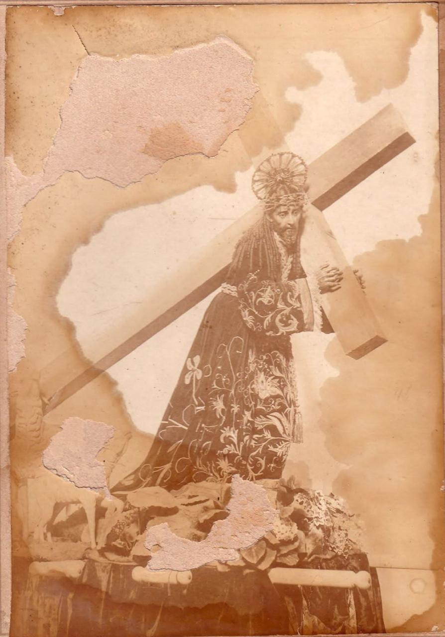 En esta fotografía restaurada se observa el anda de 1903 de Jesús Nazareno de las Tres Potencias, en la que se puede observar las dos ovejas que se incorporaron como ornamento del anda. (Foto : cortesía de Alejandro Cóbar y Édgar Flores).