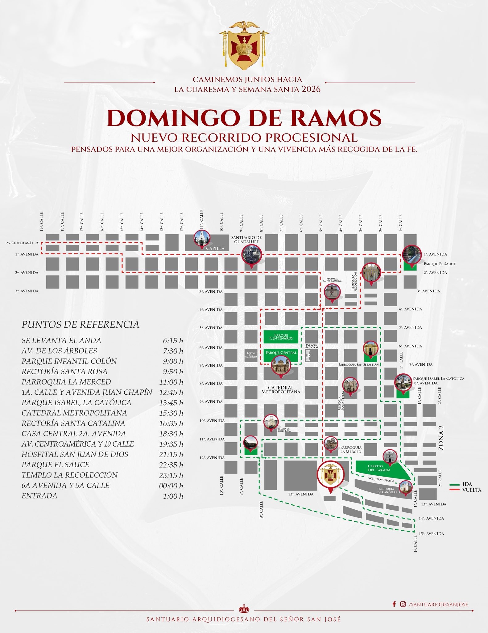 De acuerdo con la información disponible en la página oficial del Santuario Arquidiocesano del Señor San José, este es el recorrido planeado hasta el momento para el Domingo de Ramos.