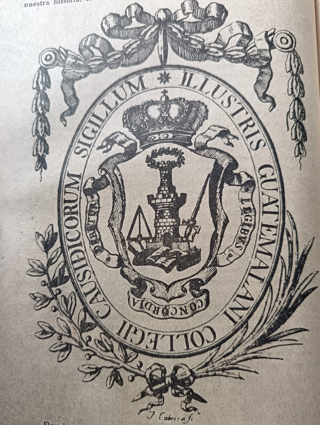 Antiguo escudo del Colegio de Abogados, creado por Cabrera, en el que se lee en latín “La concordia se debe a las leyes”. (Foto : libro Las bellas artes en Guatemala /Biblioteca César Brañas)