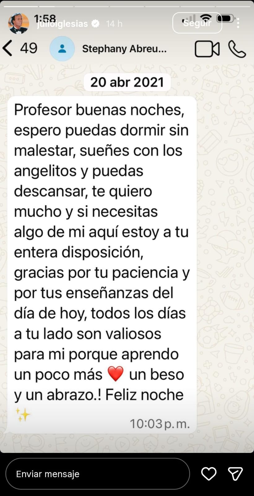 Uno de los mensajes dice: “Profesor, buenas noches. Espero que puedas dormir sin malestar, sueñes con los angelitos y logres descansar. Te quiero mucho, y si necesitas algo de mí, aquí estoy a tu disposición. Gracias por tu paciencia y tus enseñanzas del día de hoy. ¡Cada día a tu lado es valioso para mí porque aprendo un poco más! (añade un corazón). Un beso y un abrazo. ¡Feliz noche!”. Para Iglesias, este tipo de mensajes evidencian que ellas no le temían.