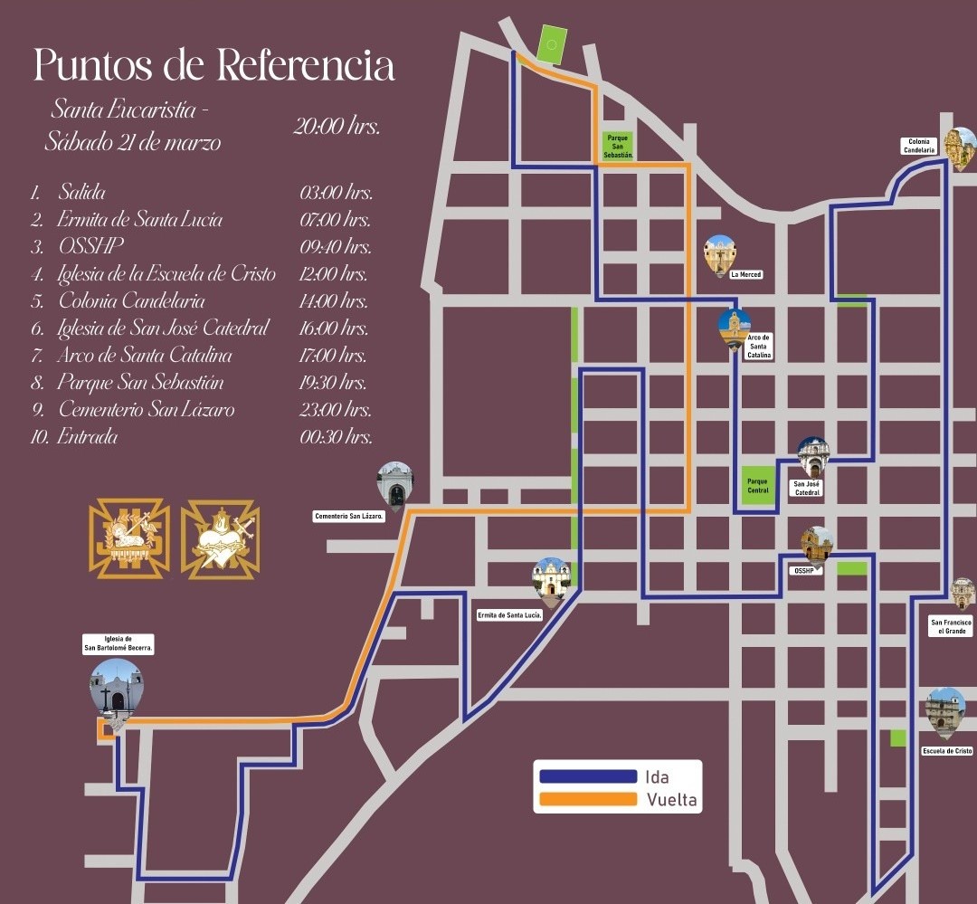 Según la información proporcionada por la Hermandad de Jesús Nazareno de la Caída y la Santísima Virgen de Dolores, estos son los puntos de referencia del recorrido procesional: