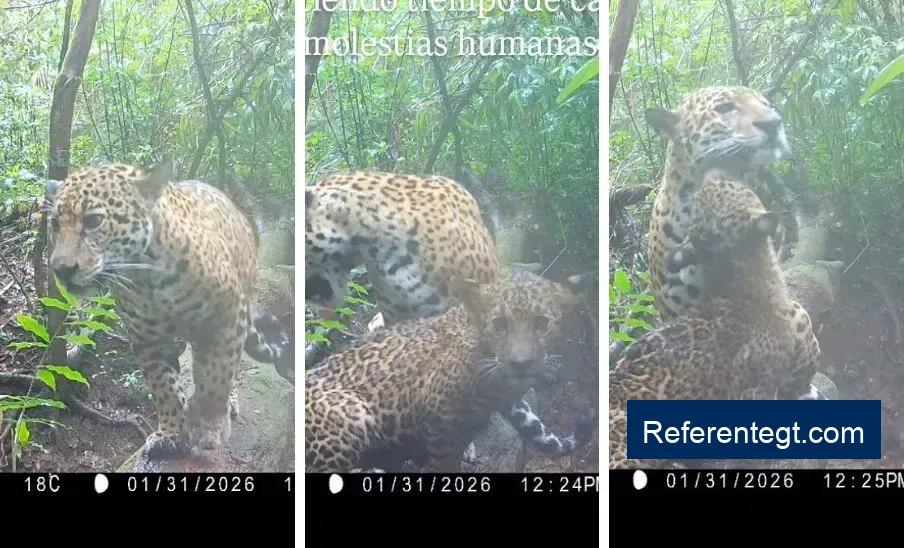 Una cámara trampa logró captar a un jaguar y su cría en Petén, una escena encantadora que se ha vuelto viral, acumulando más de 200 mil interacciones.